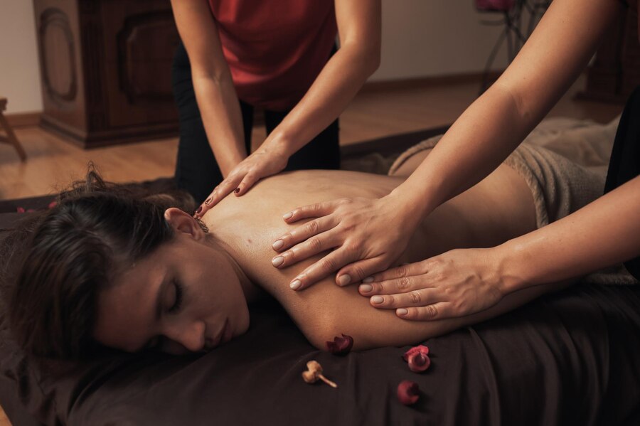 Warm stones are placed in various places of the client’s body during a hot stone massage to enhance therapeutic efficacy.